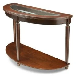 A dark cherry finish paired with a brushed silver drawer pull gives this classic Demilune shape a fresh update. The storage drawer will help to keep you organized while the open bottom shelf provides additional storage space or surface space to display your favorite accents. Try adding a decorative basket to the lower shelf creating the ideal place to stow scarves, gloves or hats.