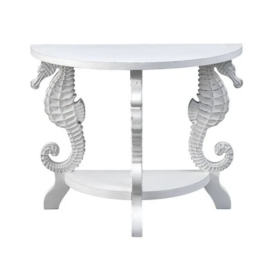 The wonders of the sea are many, and so beautiful to observe, that we just could not resist incorporating some of these into our whimsical Demilune Table. Finished in our brilliant Under the Sea White and with three intricately carved Sea Horses joining the top to the full lower shelf below, this table is perfect for your ocean side retreat. With a lamp on top and a few scattered seashells, this wonderful accent table is sure to bring a smile to everyone who sees it.