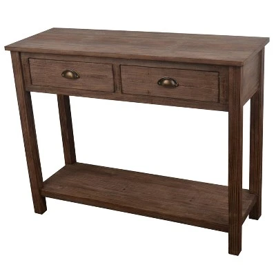 Our Vintage Distressed Console Table is designed to stylishly display your accents while providing storage in your living room or entryway. Constructed of wood with a vintage distressed finish for a rustic, timeworn feel. Adding to the benefit of this accent table are the two storage drawers, a lower shelf and bronze finished hardware. Measures: 38.75x14x30.75″