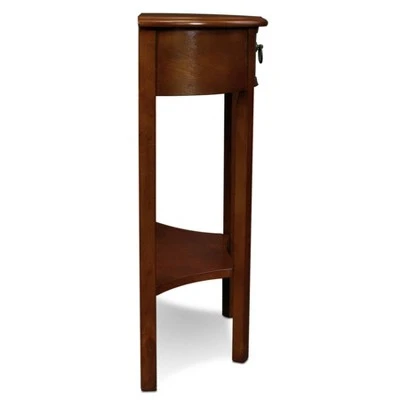 This soft silhouette is perfect for that tight area in a hallway or stair landing. Go ahead and brush by there are no corners to bump. A single drawer with blackened metal pull hardware for the things you don’t want to see and a lower display shelf for the things you do.