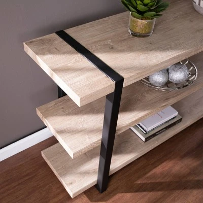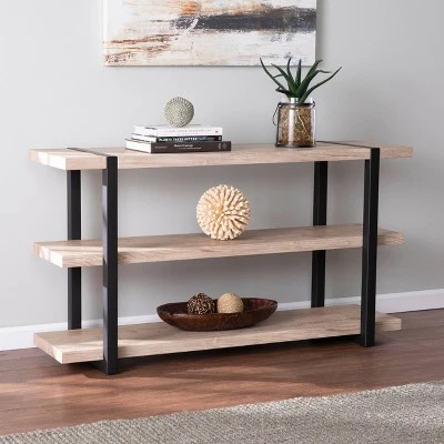 Stack up stylish storage with the Aiden Lane Grayste Console Table with Storage. Three tiers display everything from books to décor pieces to potted plants, while sleek metal legs add a touch of modern flair. Ideal in your entryway or behind a sofa, this narrow console table slides neatly into small spaces. Elegantly blend function and style when you bring home this sofa table with storage.