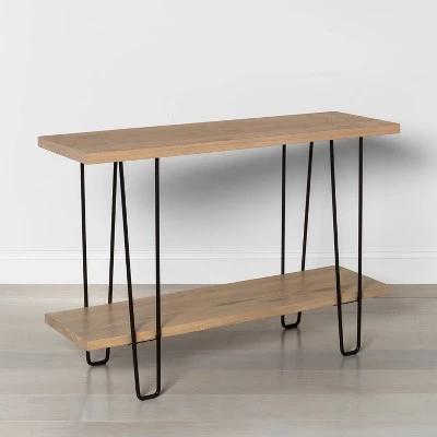 From accenting your entryway to providing a perfect spot to showcase your unique decor, this Wood & Wire Console Table from Hearth & Hand™ with Magnolia makes the perfect functional pick. Featuring a rectangular wood top and black-finished hairpin style legs, this eye-catching piece lends a touch of effortless sophistication to any room. Complete with a bottom shelf for additional storage, you’ll have plenty of space to showcase your favorite items from books to plants to pictures and more.