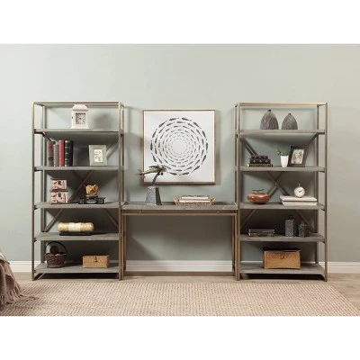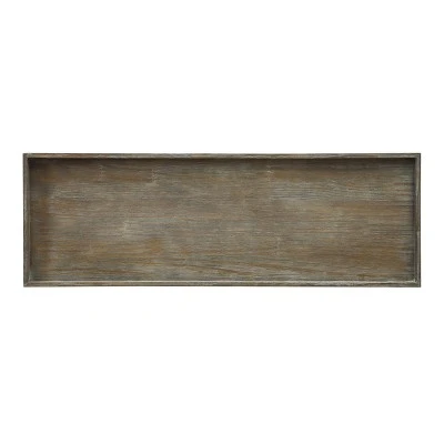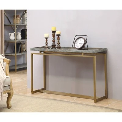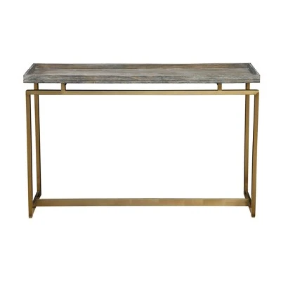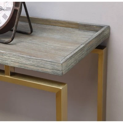 Behind your sofa with a pair of lamps, or against a wall showcasing your collection of rare Mayan artifacts, our Biscayne Collection console table is a choice selection. The wood top has a rustic Bicayne Weathered finish and a raised edge all around, and with the appearance of floating above the golden linear metal base, an ideal selection alone or when used with the matching cocktail and end tables.