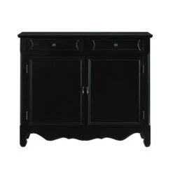 The Black Console has a sleek and simple design. The decorative curved bottom adds an extra touch of drama to the piece while the black finish is sure to fit into any home décor. The console opens with two doors to reveal storage space with interior, fixed shelf. This is the perfect piece to add to any entryway, hall, bedroom or living area. Fully Assembled. This console is easy to maintain, simply spot or wipe clean as needed.