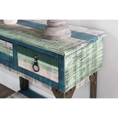 The Marley Collection combines an antique, weathered look with a warm, rustic, industrial feel. Its distressed look is trendy, popular, and full of unique character. The 2-Drawer Hall Console is a perfect addition to any area of your home. It features 2 deep upper drawers and a shelf below which provides ample storage space for a variety of items. Drawers feature antique bronze finished pulls with colored wood handles. Fully assembled. Easy to maintain, spot or wipe clean when necessary.