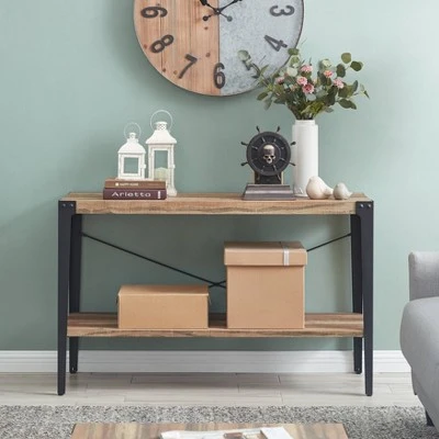 Offering rustic charm to living spaces, the Modern Industrial Console Table in Metal and Distressed Wood by Danya B. is masterfully crafted with a focus on contemporary design. Tapered metal legs display visible nail heads, while distressed finish wood stays true to its rustic design. The addition of a stretcher beam offers stability and visual interest. This rustic console is great for displaying books, magazines, and tabletop decor in a home or office.