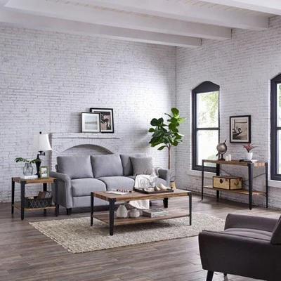 - Features a modern rustic industrial design with tapered metal legs, visible nail heads and surface areas in a weathered wood finish