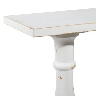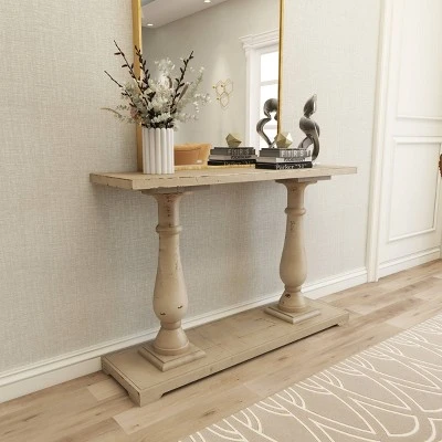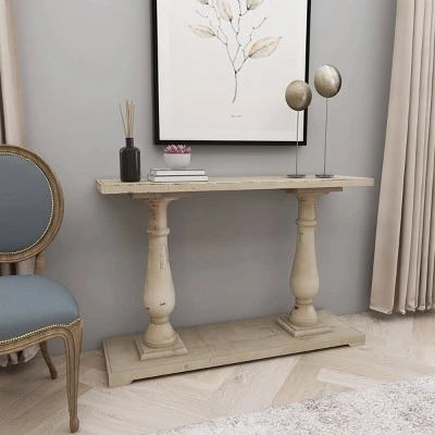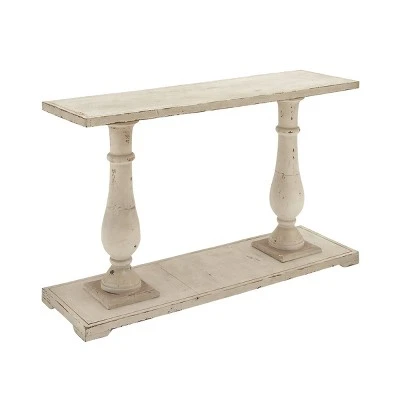 - This farmhouse style inspired white Chinese fir wood console table features 2 pillar columns as legs attached to a rectangular base with a slight elevation