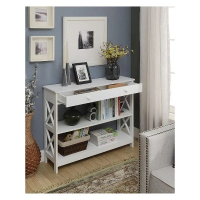 Give your home a handsome makeover with the Oxford 1 Drawer Console Table with Shelves. Featuring a bottom and middle shelf as well as a drawer for concealed storage you can display collectibles and hide away unsightly accessories. The X pattern creates a modern appeal with clean lines. Crafted to last the Oxford 1 Drawer Console Table with Shelves will quickly become a staple in your home. Also available in multiple finishes it will easily complement any decor. Look for other items from the Oxford Collection for the complete look sold separately.