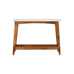 Whether welcoming guests into your home or nestled up behind your sofa, this console table will always be a stylish stage. Crafted from solid mango wood, its frame features flared legs, an open lower shelf, and a warm hazelnut finish for a natural touch. Up above, the narrow rectangular top features a gorgeous and durable white marble slab creating contrast. This design provides the perfect place to display your favorite lamp, vase, or candles below a beautiful piece of art.