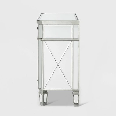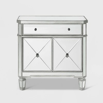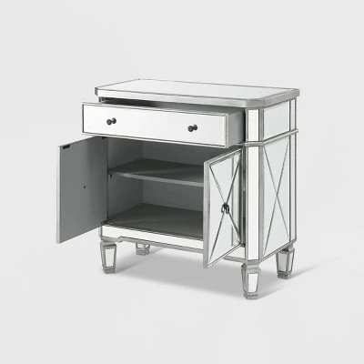 The Mirrored Console is the perfect compliment to your home. Featuring one drawer and two doors, this piece provides ample storage space with an interior, fixed shelving unit. The gray wood and mirror surfaces are highly adaptable to any homes decor. The unique details are eye catching, enduring, and are sure to enhance any space. Fully assembled.