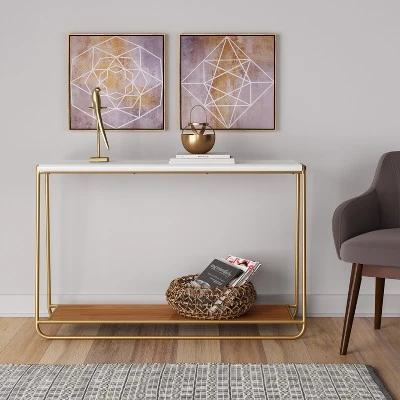 - Console table with white top, gold legs and a light wood shelf for a modern look