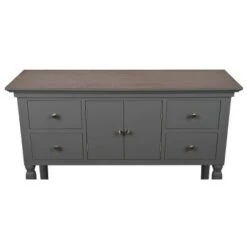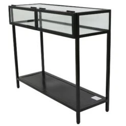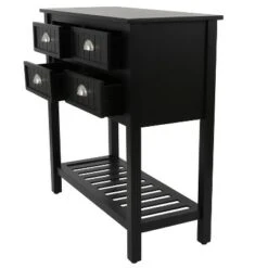 Design and functionality meet in harmony to create the Simplify Shutter Drawer Console Table. This rectangular console table can bring style and functionality to living room, entryway or dining room. The simple, clean lines lend a modern feel, while the turned legs add a traditional element, creating a transitional, timeless look. Two large shutter style storage drawers keep clutter out of sight and provide ample storage space to keep your home organized. Place this sofa table behind a couch for extra storage in the family space, under a wall mounted television to create a sophisticated look or top it with a table lamp and catch all basket in the foyer. The lower shelf doubles your storage capabilities and is ideal for housing baskets, magazines or books. Constructed of wood solids and MDF for long lasting durability. Measures 37×13.75×29.5″