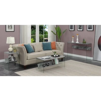 Strike a pose with this chic SoHo Console Table/Desk by Breighton Home. Clean lines and an elegant silhouette will bring any living space from gloom to glam with this modern piece! The sturdy tempered glass side frame gives the illusion of a floating shelf, effortlessly drawing attention to your favorite décor. This stylish unit is also crafted with hollow core and particleboard finished with a rich melamine laminate. A beautiful unit like this has much versatility and can be used as a console table, desk, or vanity. Bring your favorite living space to life right after delivery with the easy 3-step assembly. Coordinate with additional modern pieces from the SoHo Collection by Breighton Home, each sold separately.
