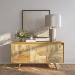 Striking knots and grain patterns in the mango wood of this console come to life in geometric cuts that pair wonderfully in both traditional and contemporary decor settings. 4 shelves support up to 45 lbs each, offering generous storage for dinnerware, electronics, or any other items you’d like to keep tucked away but readily accessible. Measuring at 58” L X 16” D X 30” H, this piece is perfect as a tv stand or extra storage in your dining room, entryway or bedroom.